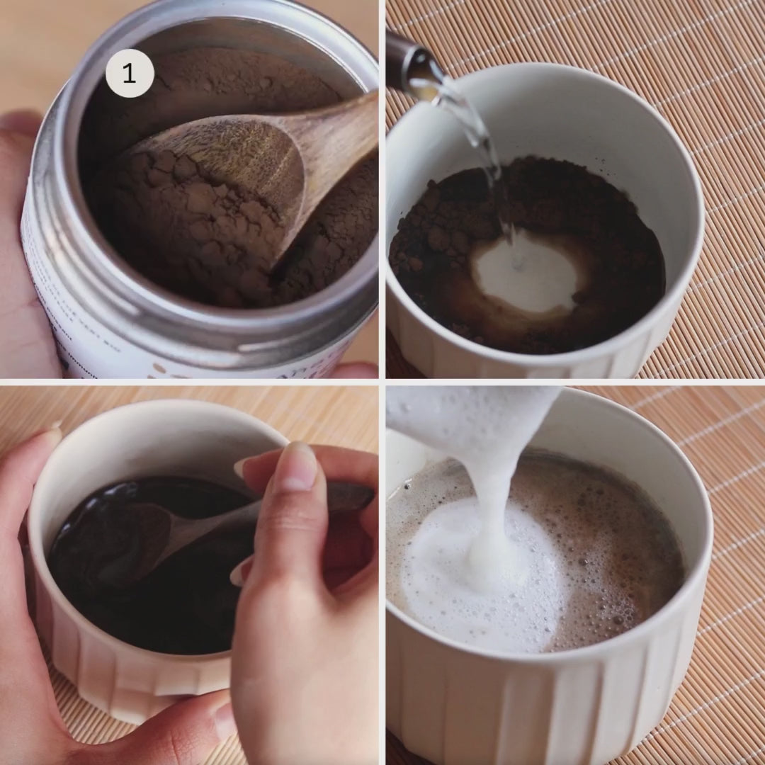 • Étapes 3 et 4 : Mélangez à l’aide d’une cuillère. Dégustez-le tel quel, avec un peu plus d’eau ou ajoutez-y du lait pour un délicieux hojicha latte.